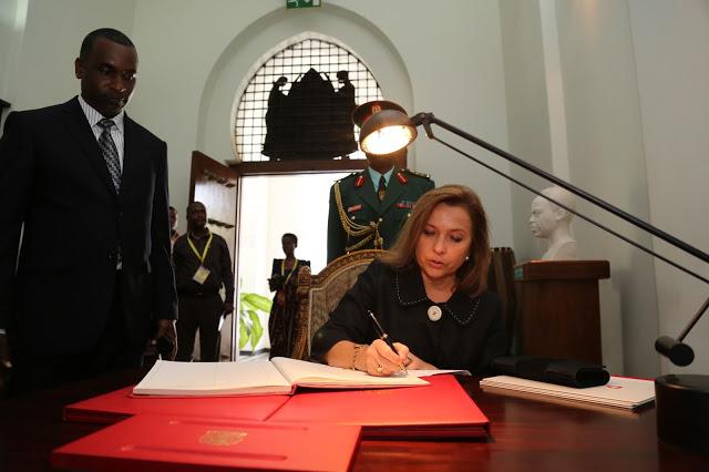 Balozi wa Uswis nchini Tanzania Mhe. Florence Tinguely Mattl akisaini kitabu.