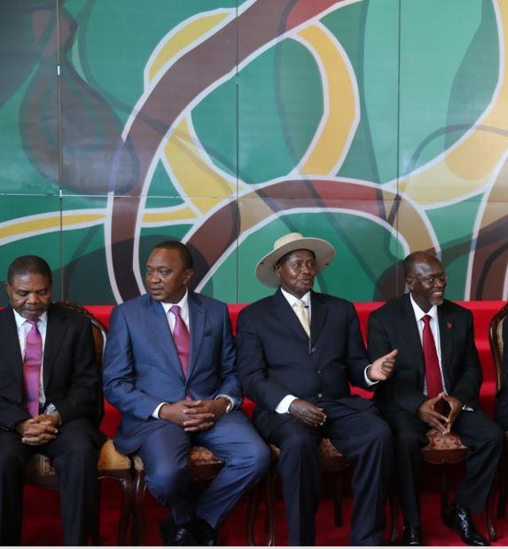 Rais wa Jamhuri ya Muungano wa Tanzania Dkt. John Pombe magufuli akiwa na Rais Yoweri Museveni,Uhuru Kenyatta na Rais wa Serikali ya Mapinduzi ya Zanzibar Dkt. Ally Mohammed Shein