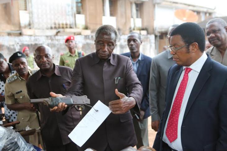 Waziri Mkuu, Kassim Majaliwa akipata maelezo kutoka kwa mkuu wa mkoa wa Kigoma, Issa Machibya kuhusu bunduki iliyokatwa ili kupunguzwa urefu.